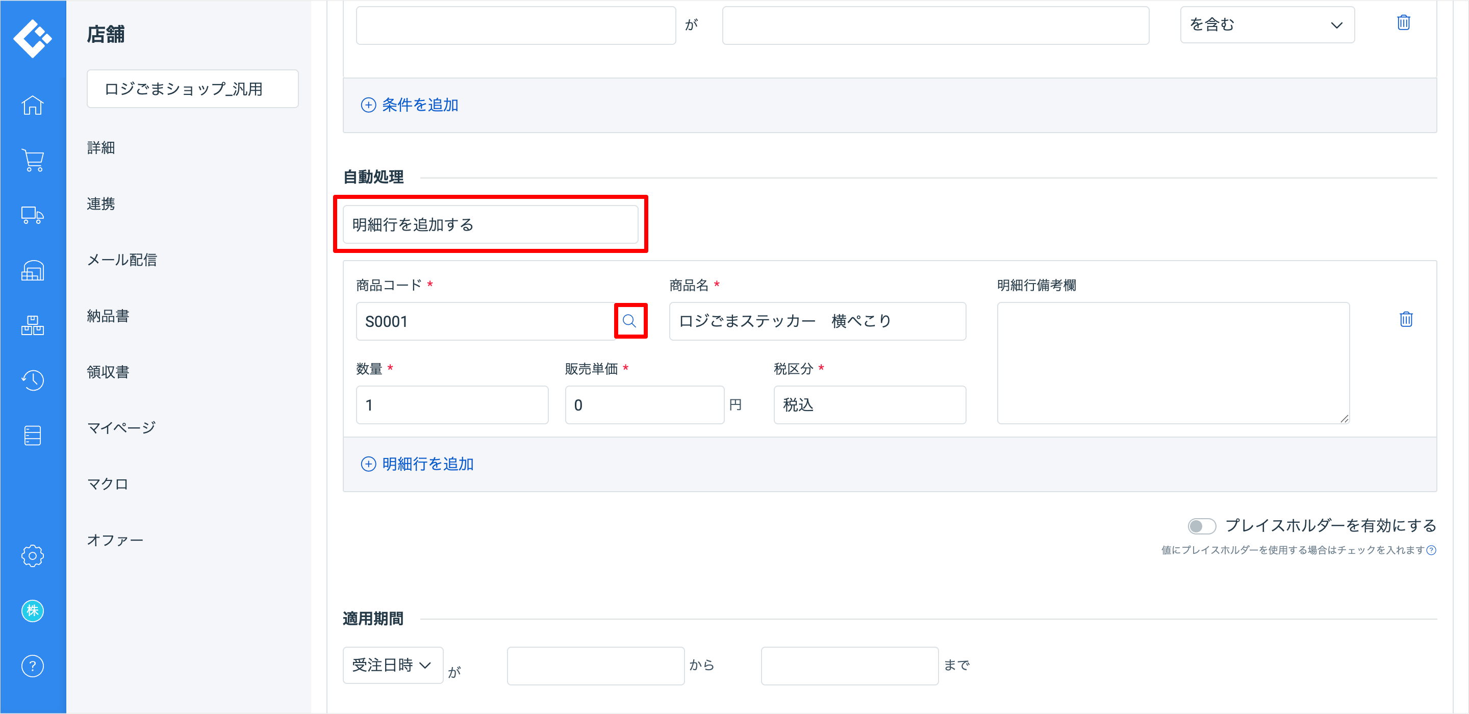 受注伝票のマクロの「明細行を追加する」の設定で、商品マスタを参照することで商品登録を簡略化しました。