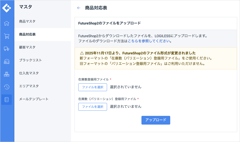 そのため、futureShopの在庫連携に使用する「商品対応表の自動生成」について、操作が一部変更されました。