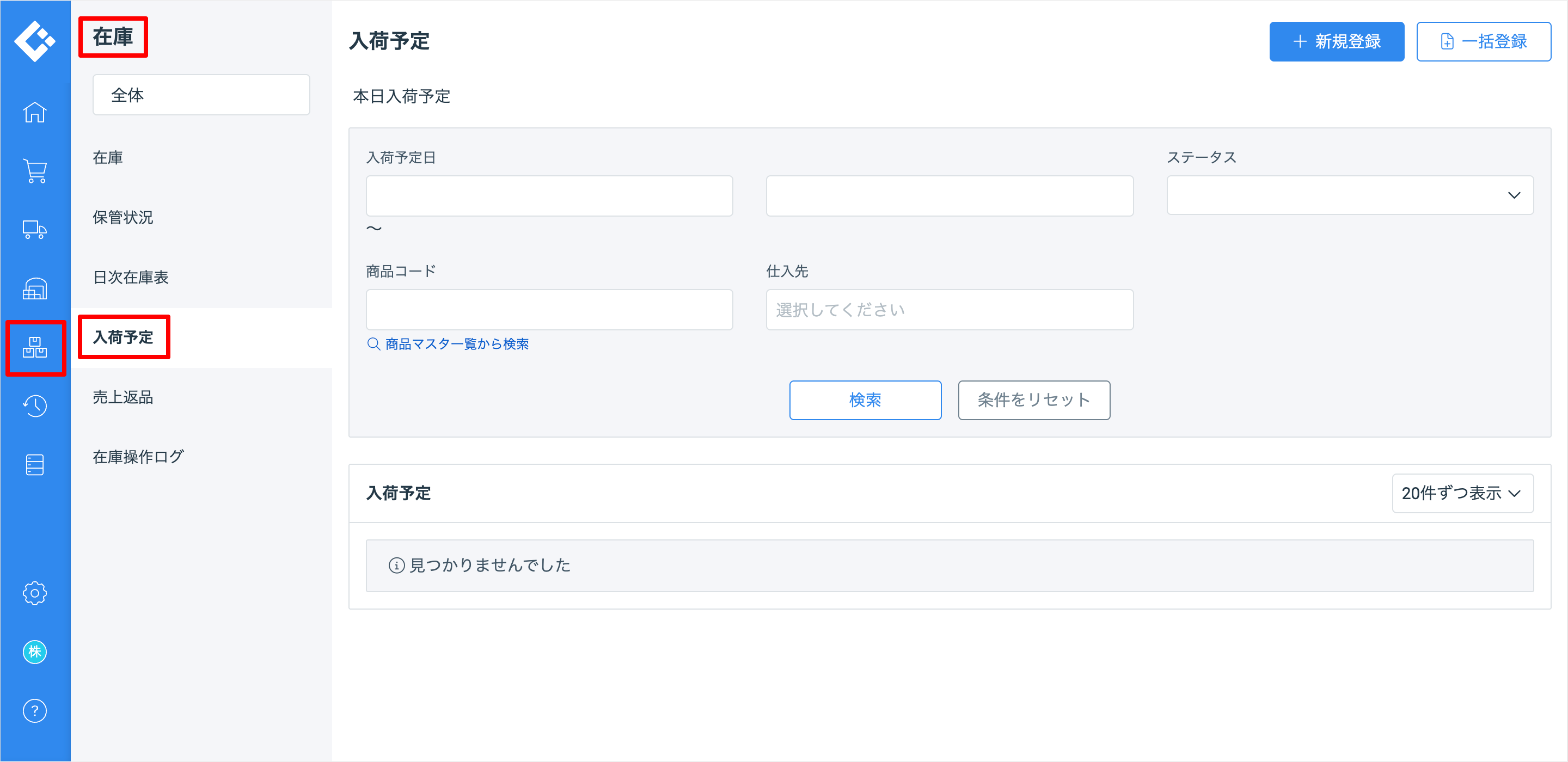 メインナビゲーションの「在庫」を押し、サブナビゲーションの「入荷予定」を押すと表示される入荷予定登録機能の提供を終了します。