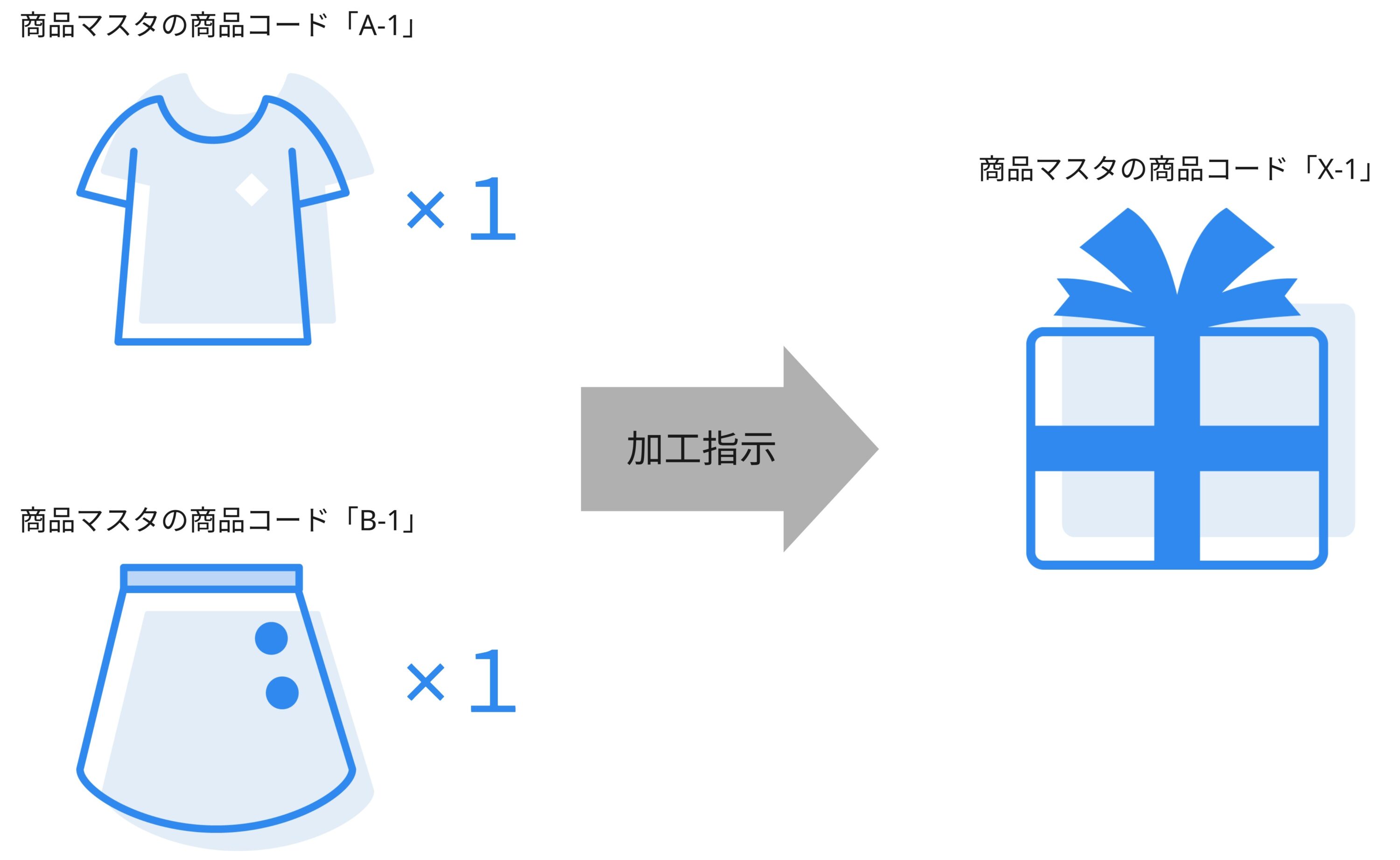 マーチャント側でセット組構成品目を登録し加工指示をすることで、オペレーター側に加工指示が連携されます。オペレーター側で加工指示の作業を完了することで、特定の商品マスタの在庫を減らし、別の商品マスタの在庫を増やすことができます。
