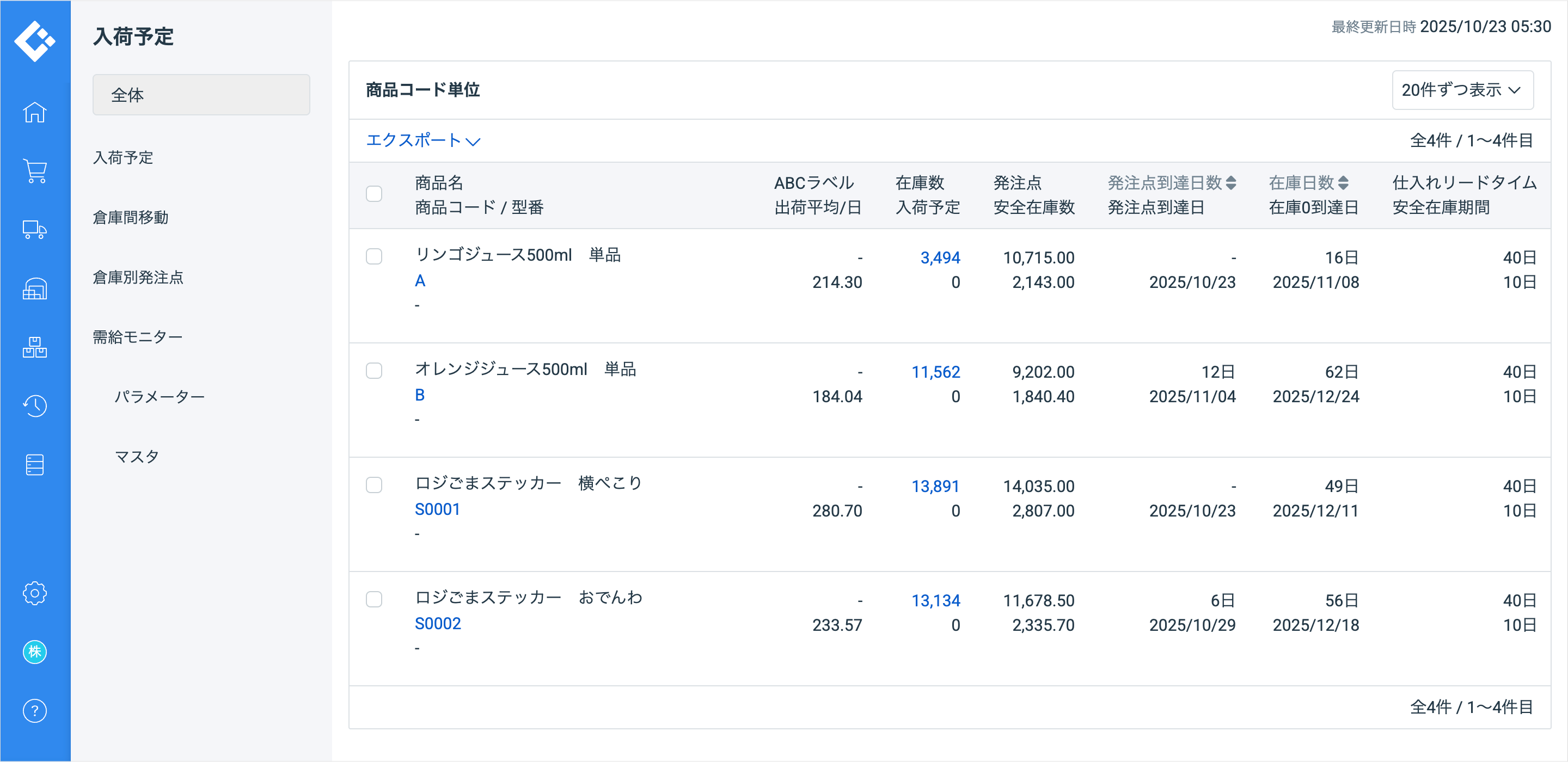 エクスポート項目に発注点と最小発注数を入れておくと、発注数の算出に便利です。