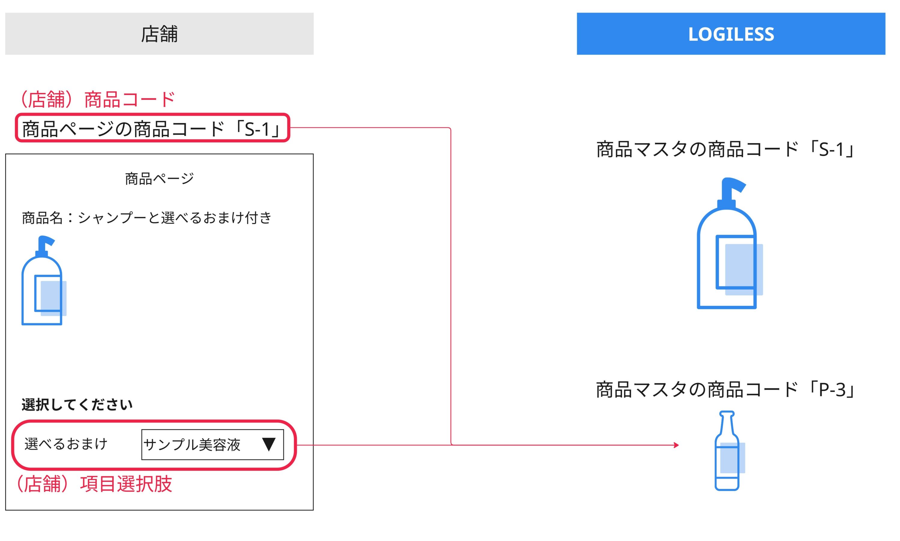 シャンプーと選べるおまけ付きの商品ページを例に、商品エイリアスの設定と動作後の受注伝票の明細行について説明します。