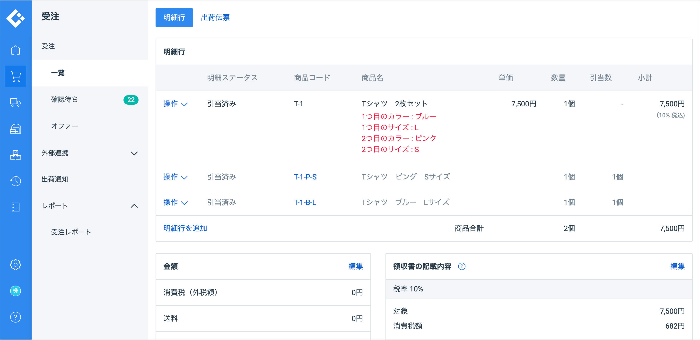 T-1の商品ページで4つの項目選択肢がそれぞれ、1つ目のカラー:ブルー、1つ目のサイズ:L、2つ目のカラー:ピンク、2つ目のサイズ:Sを選択した注文が取り込まれた場合、受注伝票の明細行は以下の画像の通りに変換されます。