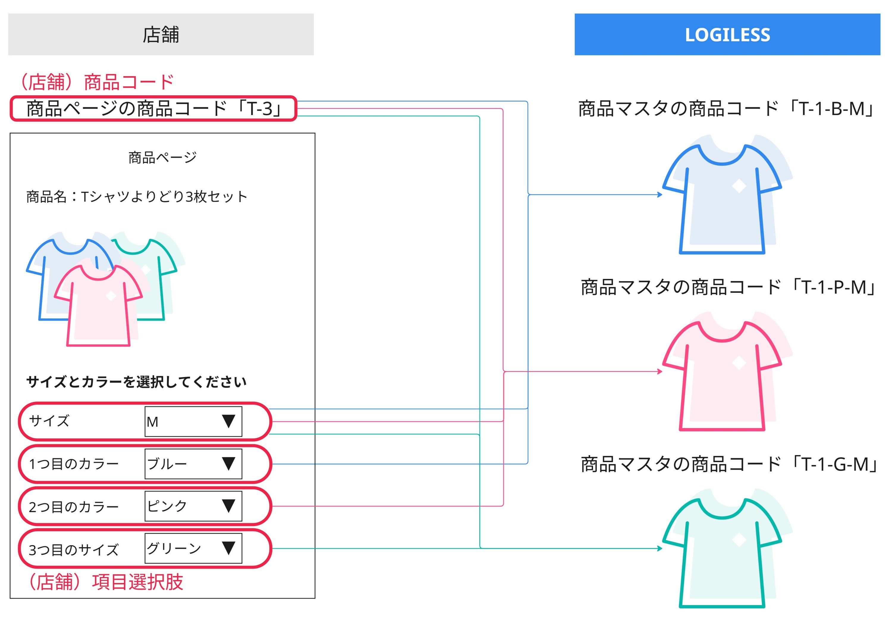 Tシャツよりどり3枚セットの商品ページを例に、商品エイリアスの設定と動作後の受注伝票の明細行について説明します。