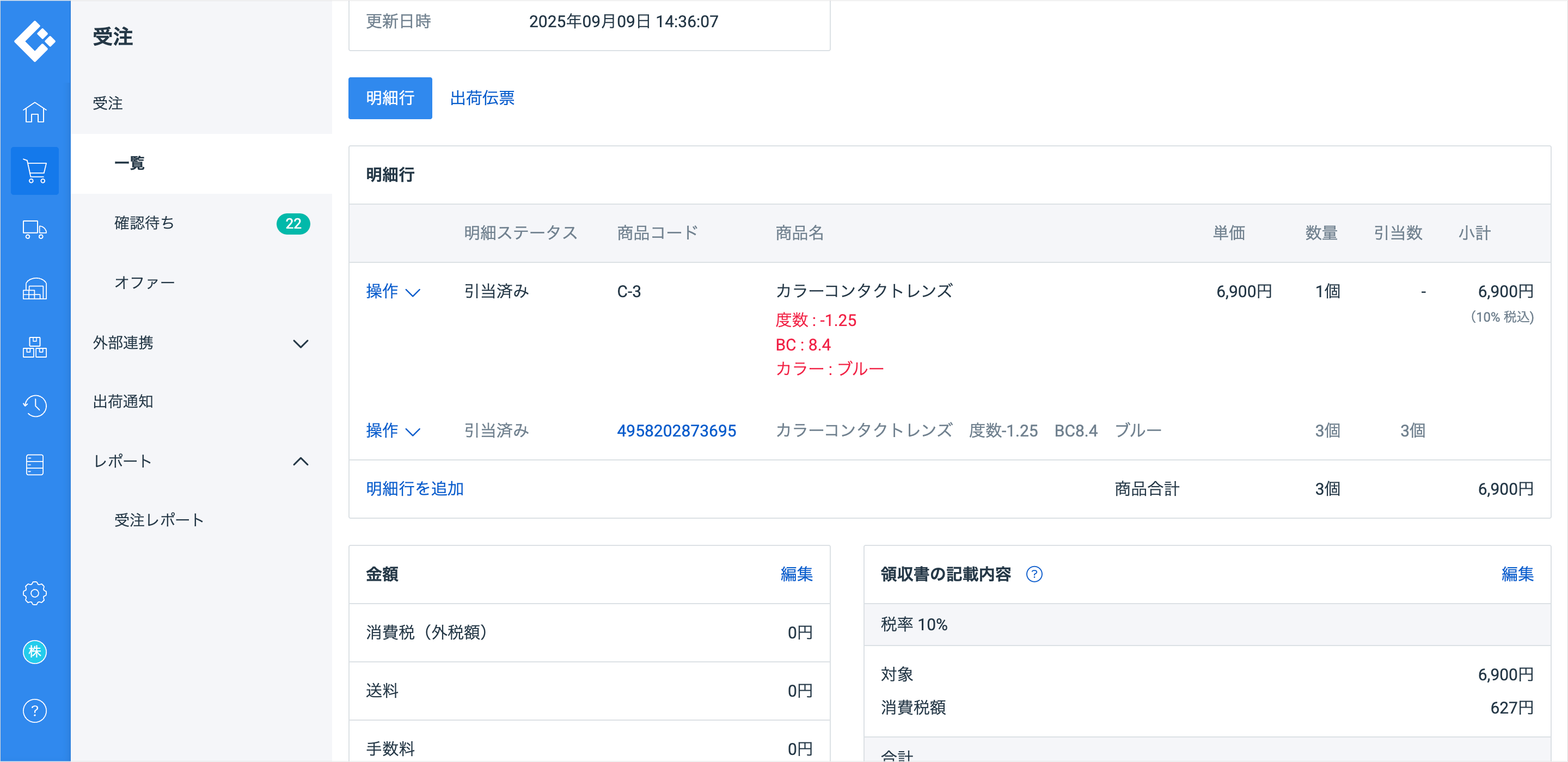 C-3の商品ページで3つの項目選択肢がそれぞれ、度数:-1.25、BC:8.4、カラー:ブルーを選択した注文が取り込まれた場合、受注伝票の明細行は以下の画像の通りに変換されます。