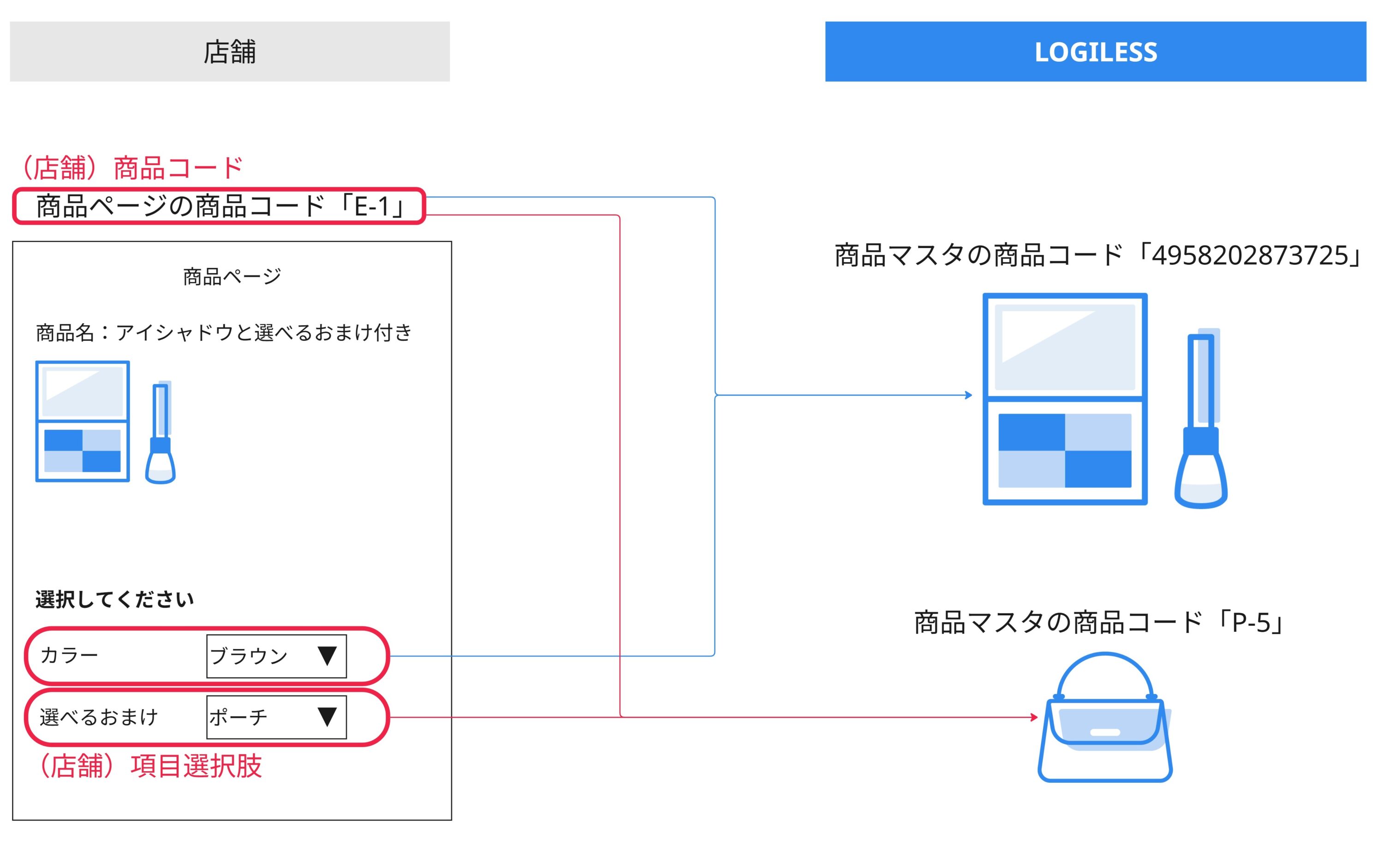アイシャドウと選べるおまけ付きの商品ページを例に、商品エイリアスの設定と動作後の受注伝票の明細行について説明します。
