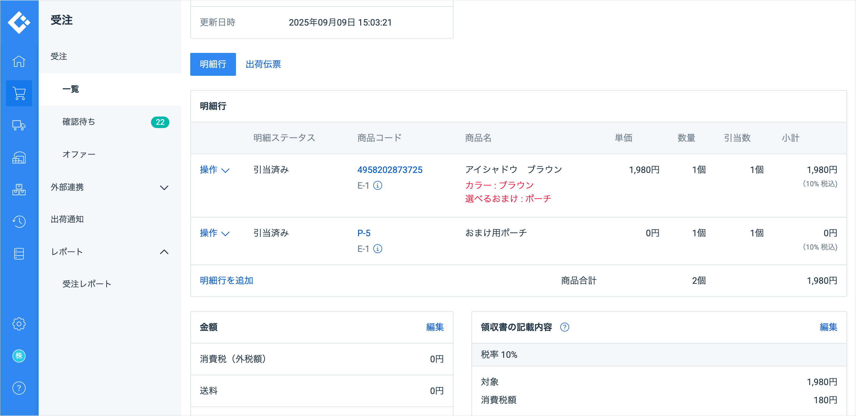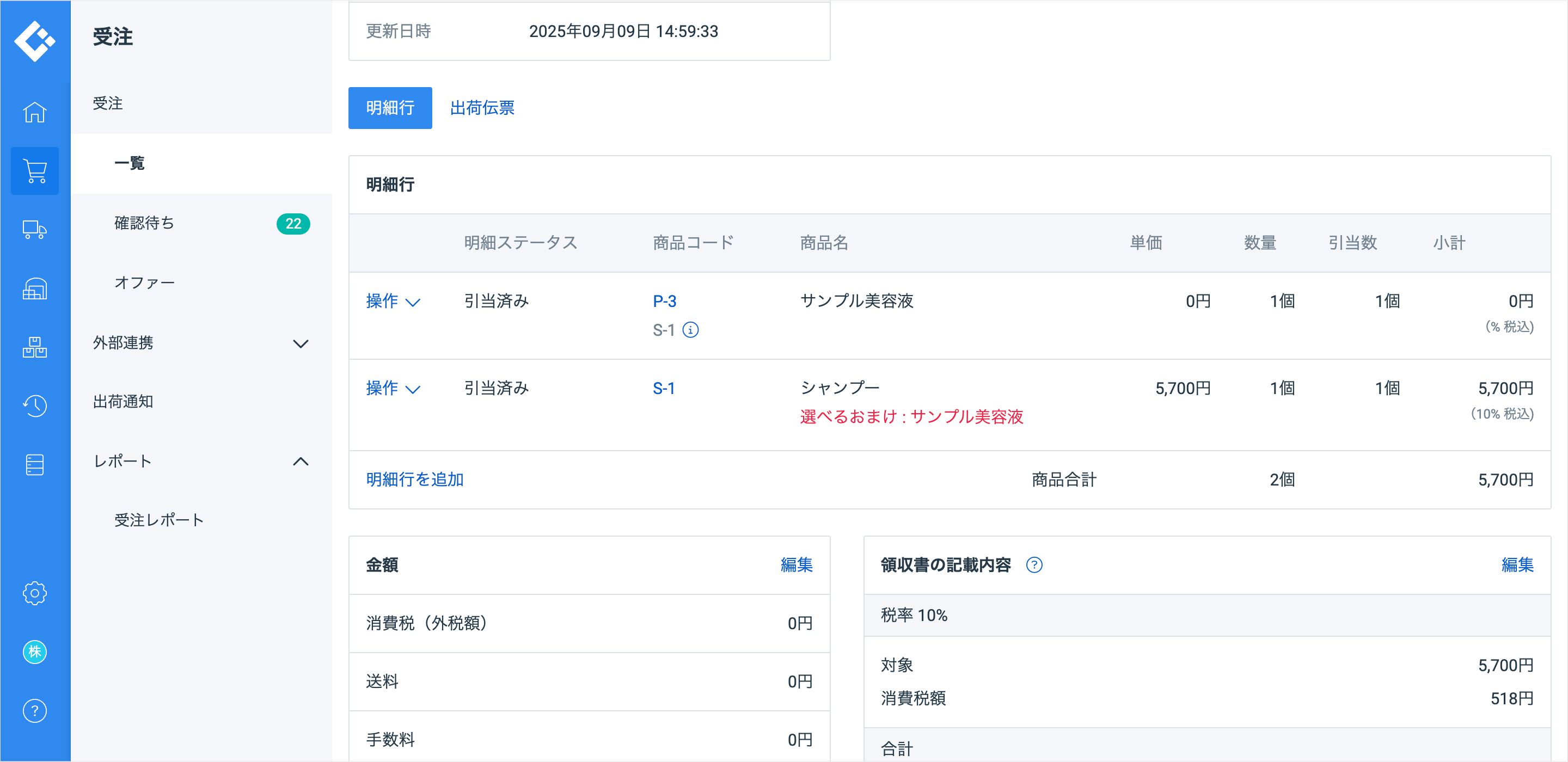 S-1の商品ページで、項目選択肢が選べるおまけ:美容液サンプルを選択した注文が取り込まれた場合、受注伝票の明細行は以下の画像の通りに変換されます。