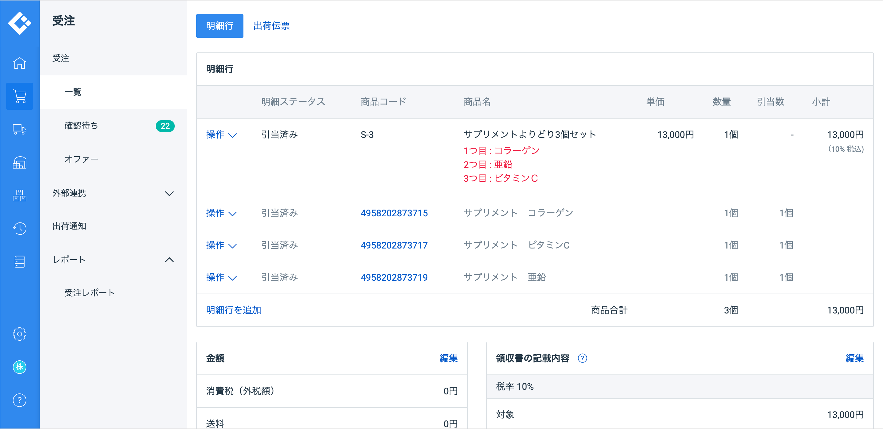 S-3の商品ページで3つの項目選択肢がそれぞれ、1つ目:コラーゲン、2つ目:亜鉛、3つ目:ビタミンCを選択した注文が取り込まれた場合、受注伝票の明細行は以下の画像の通りに変換されます。