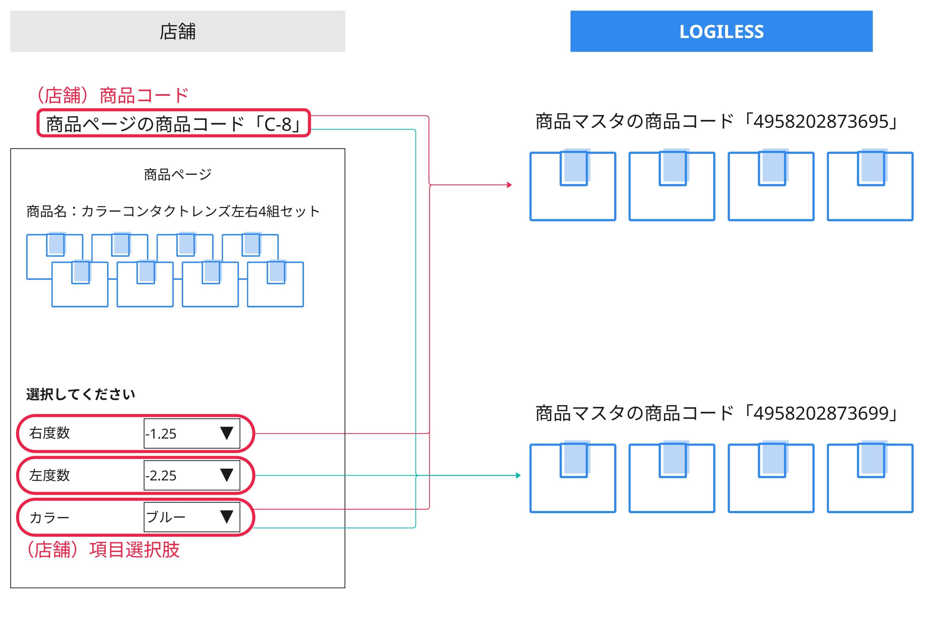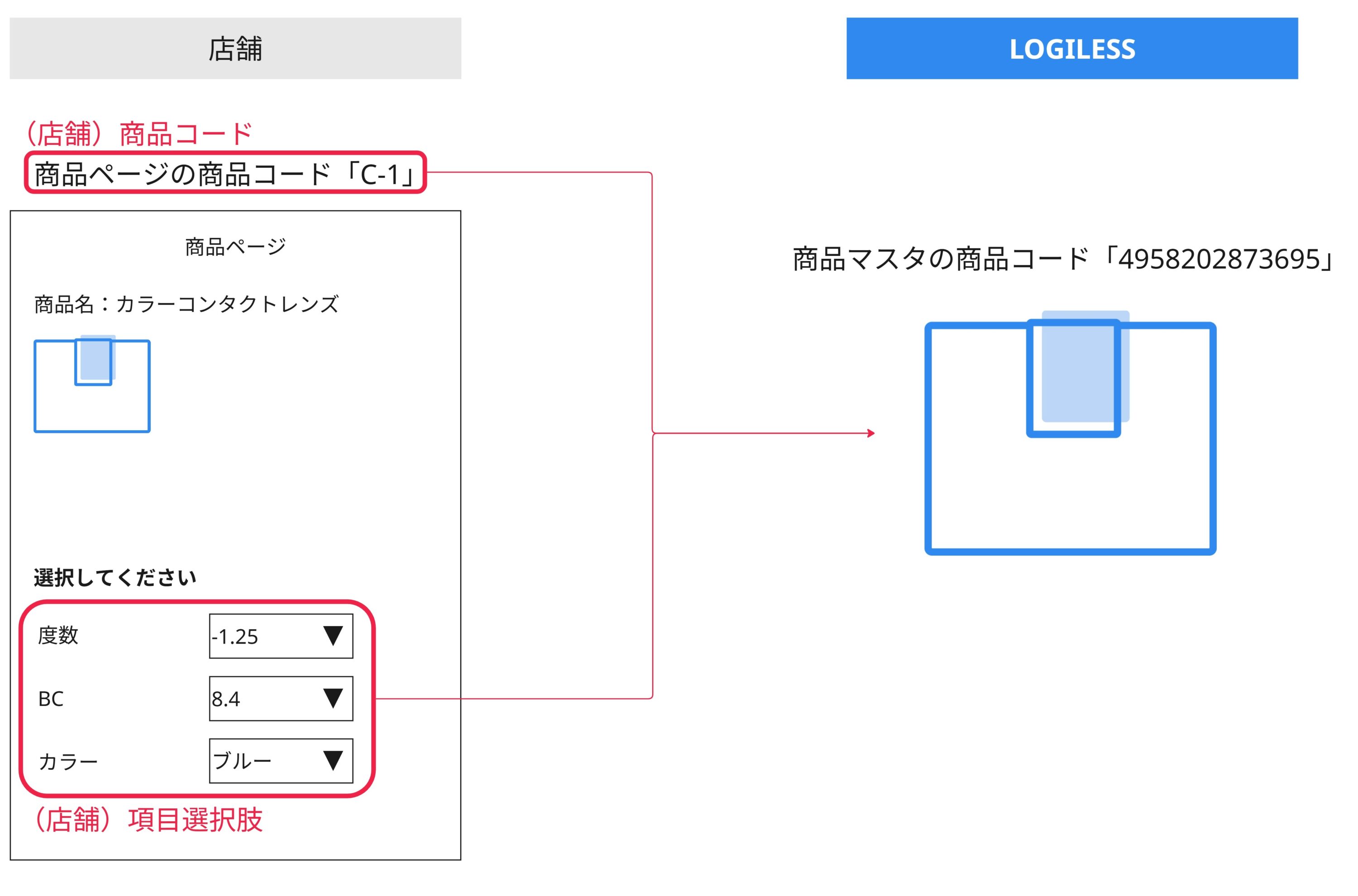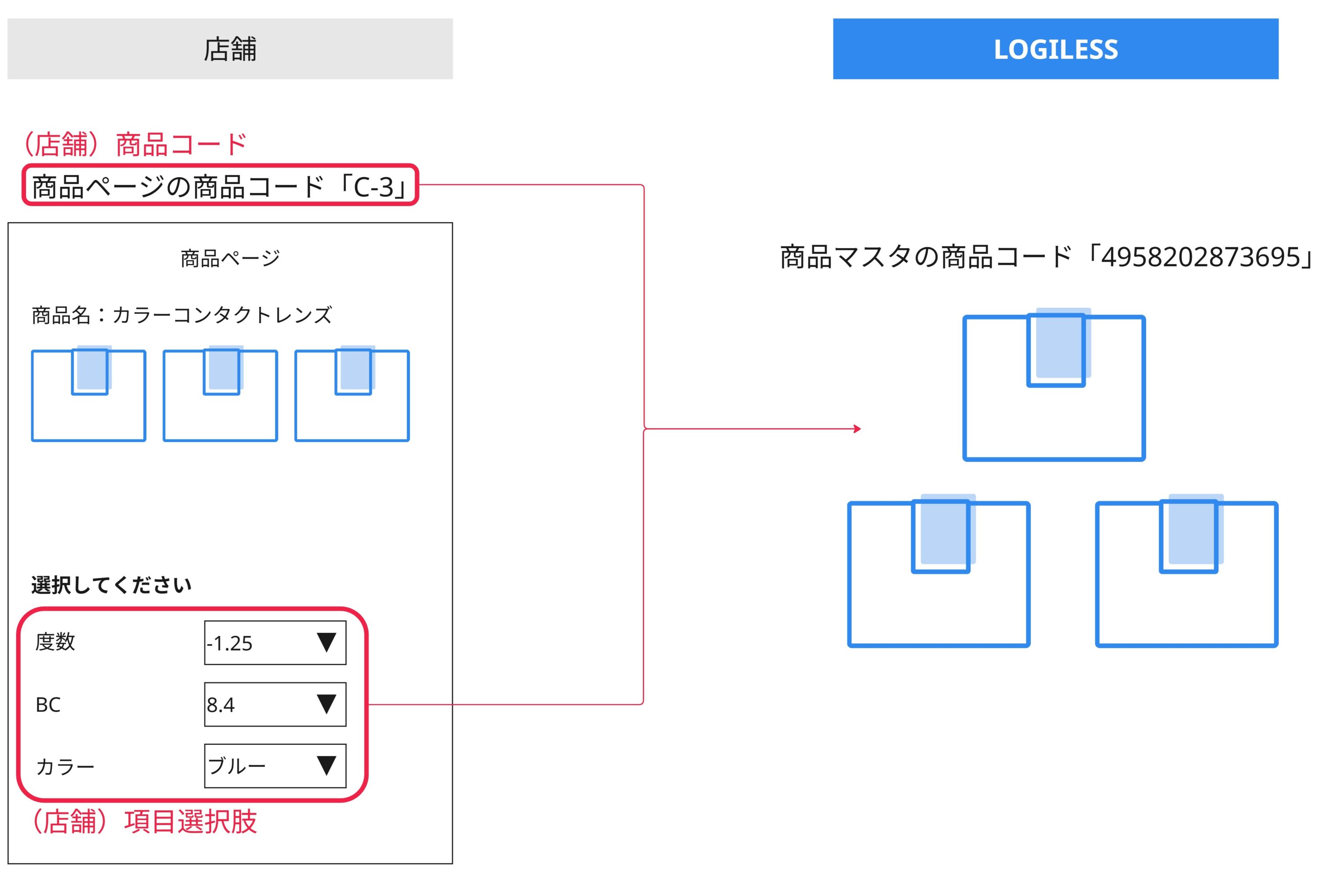 カラーコンタクトレンズの商品ページを例に、商品エイリアスの設定と動作後の受注伝票の明細行について説明します。
