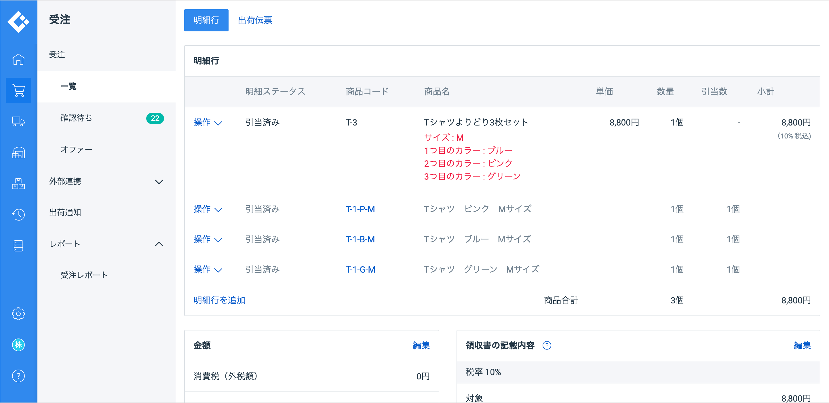 T-3の商品ページで4つの項目選択肢がそれぞれ、サイズ:M、カラー1つ目:ブルー、カラー2つ目:ピンク、カラー3つ目:グリーンを選択した注文が取り込まれた場合、受注伝票の明細行は以下の画像の通りに変換されます。