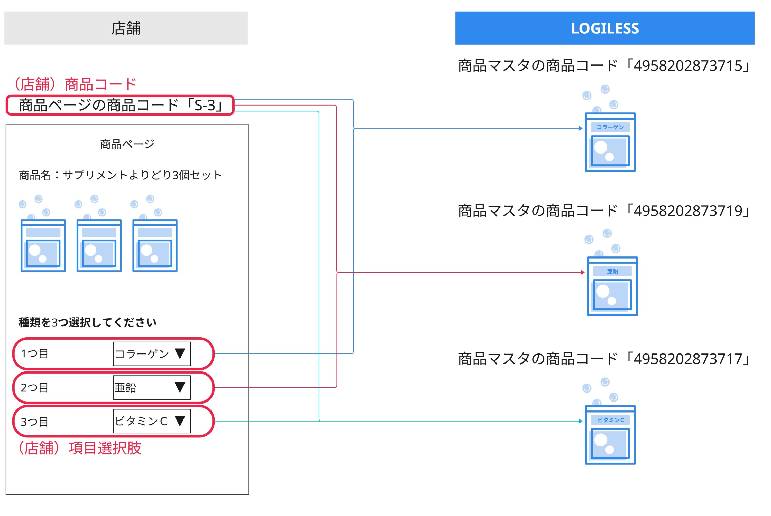 サプリメントよりどり3個セットの商品ページを例に、商品エイリアスの設定と動作後の受注伝票の明細行について説明します。