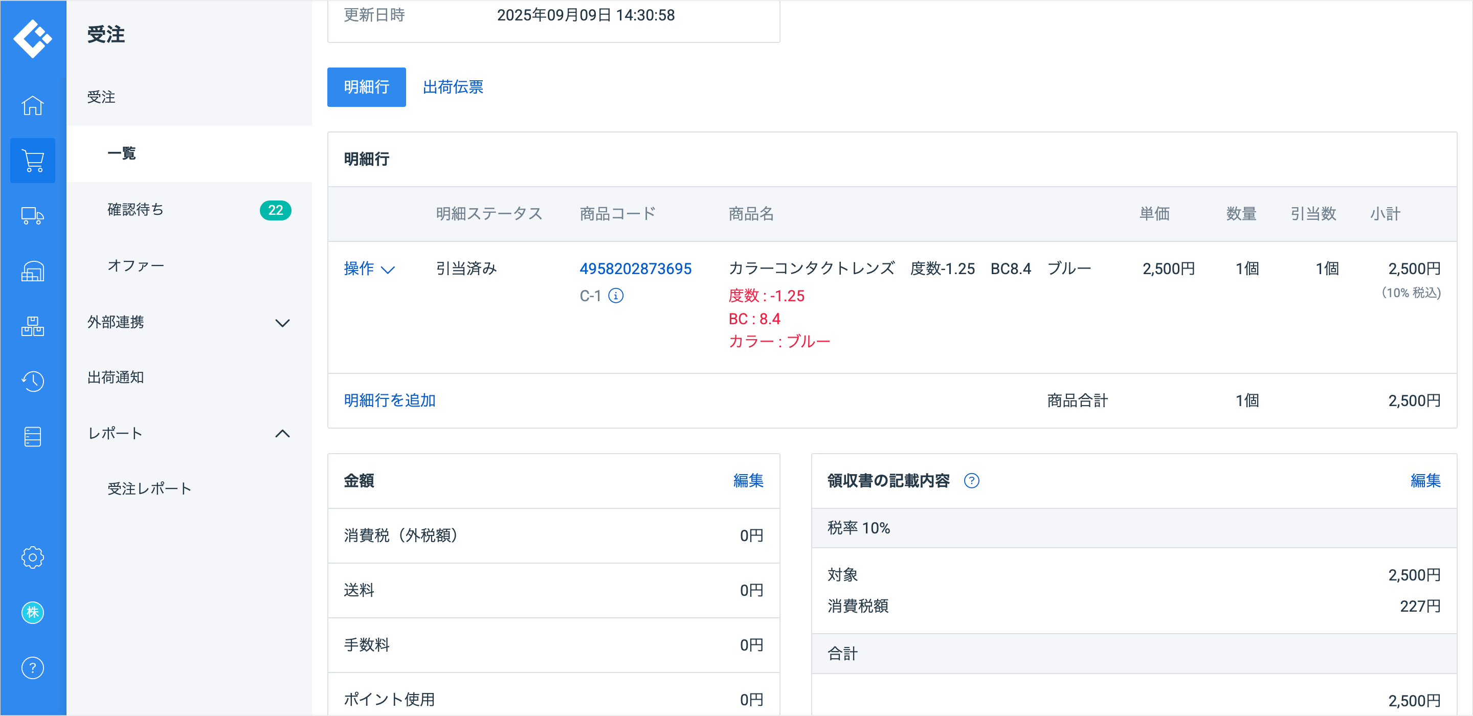 C-1の商品ページで3つの項目選択肢がそれぞれ、度数:-1.25、BC:8.4、カラー:ブルーを選択した注文が取り込まれた場合、受注伝票の明細行は以下の画像の通りに変換されます。