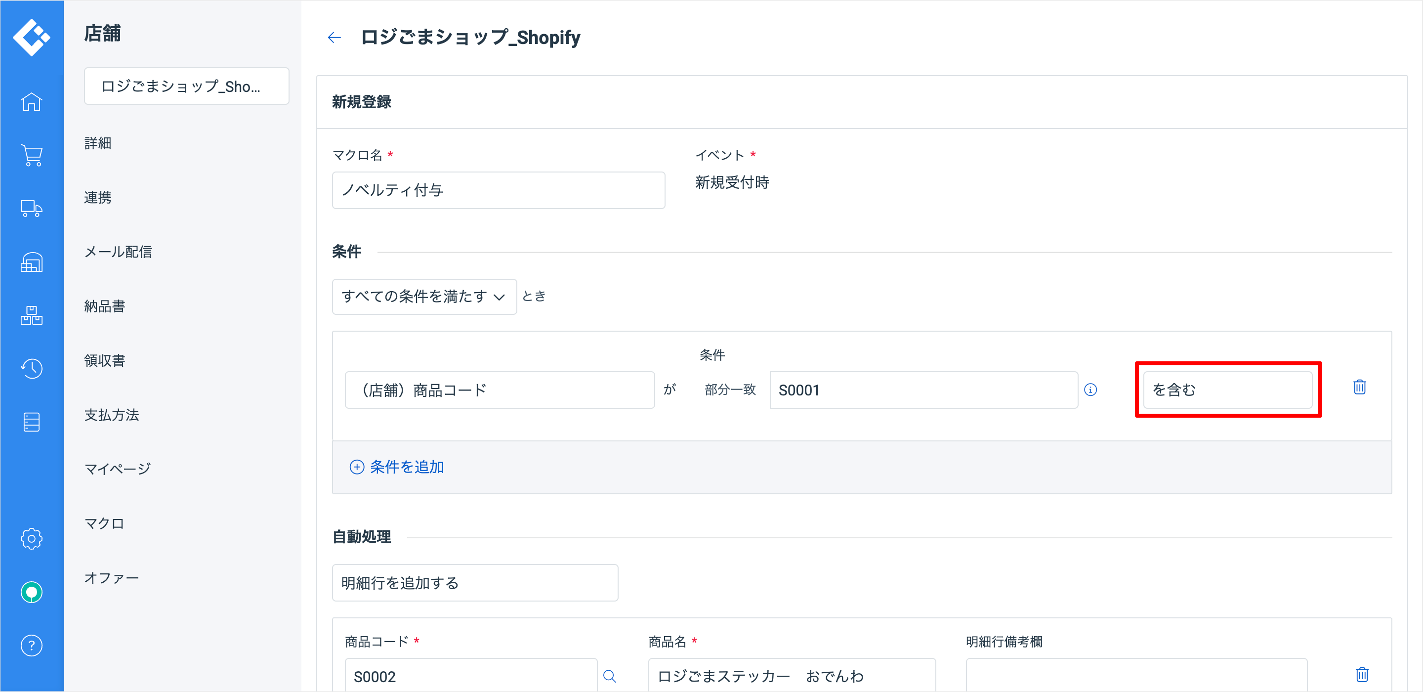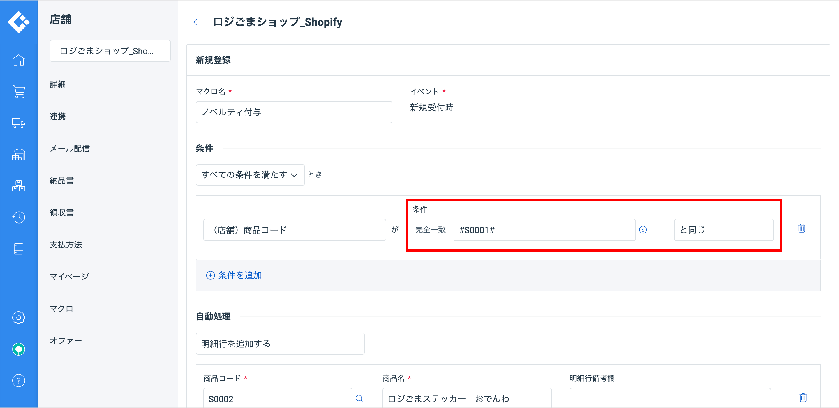 例えば「(店舗)商品コード:#S0001#と同じ」という条件を設定した場合、受注伝票の明細行が「(店舗)商品コード:S0001」のみの受注伝票にマクロは適用されます。他に明細行がある場合は適用されません。