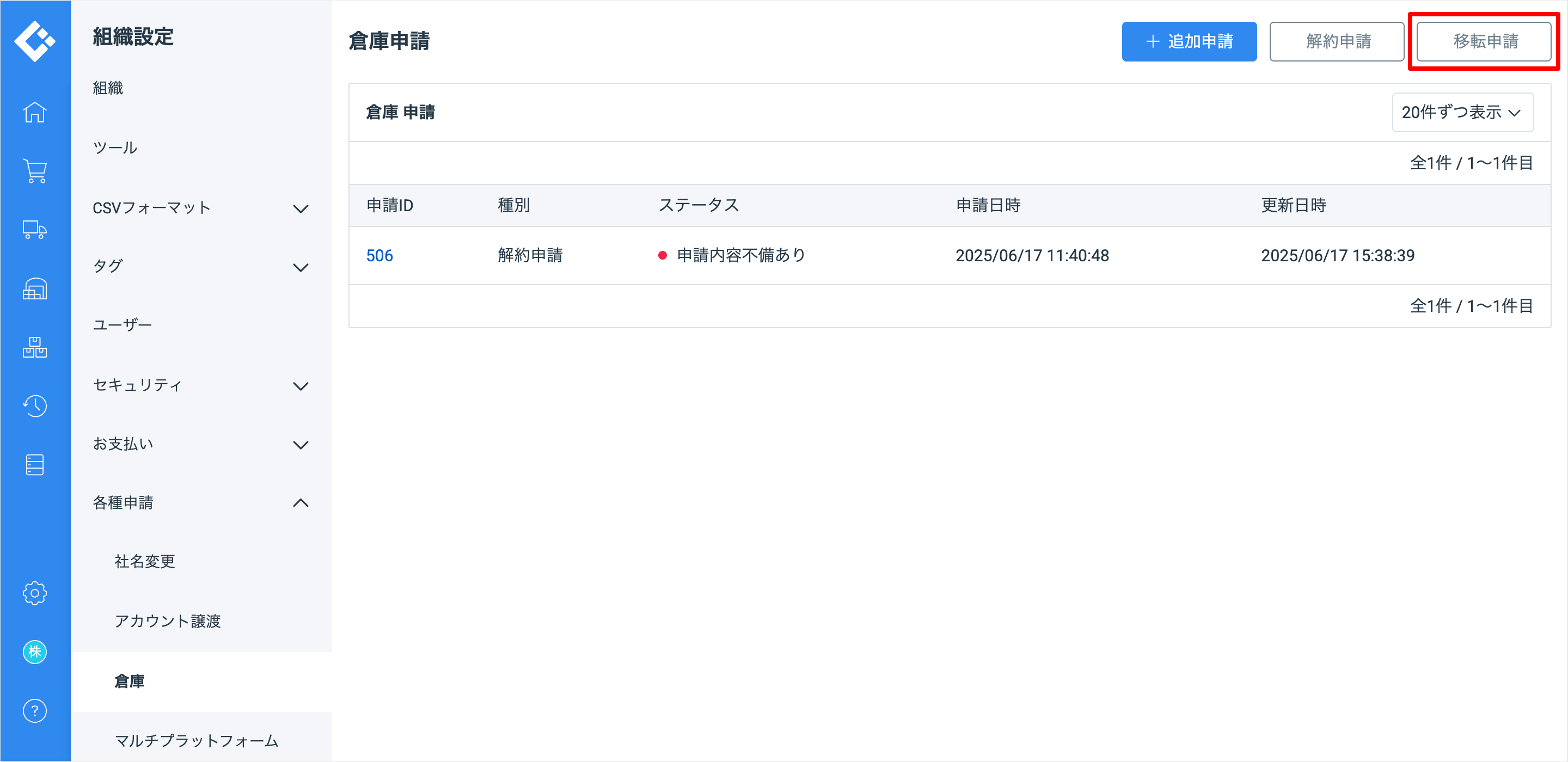 倉庫の移転とは、利用中のマーチャントアカウントに対して倉庫として新たにオペレーターアカウントを紐づけ、利用を終了する倉庫との連携を解除するための申請です。