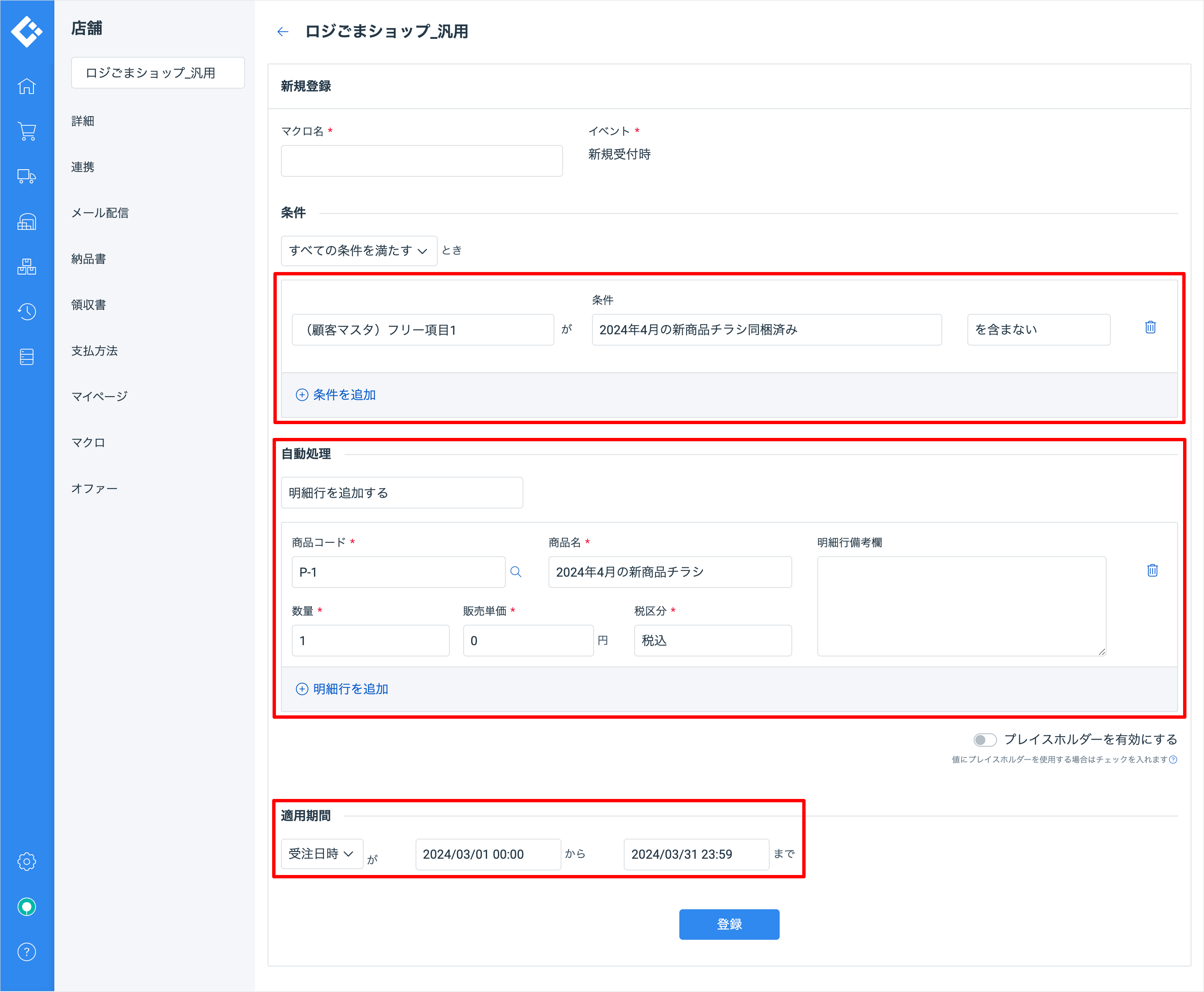 メールアドレスで同一顧客かどうかを判定し、2024年3月の期間中に初めて購入した場合に、商品コード「P-1」商品名「2024年4月の新商品チラシ」を1個つけます。