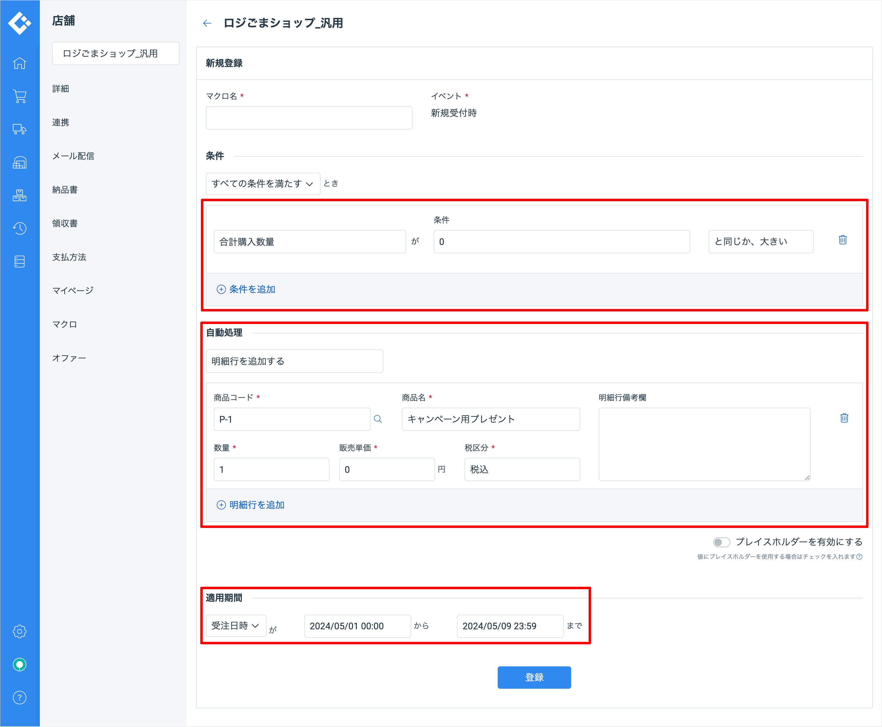 受注日時が「2024/05/01 00:00」から「2024/5/9 23:59」までに当てはまるので、マクロが動作し、プレゼント用商品P-1が明細行に追加されます。