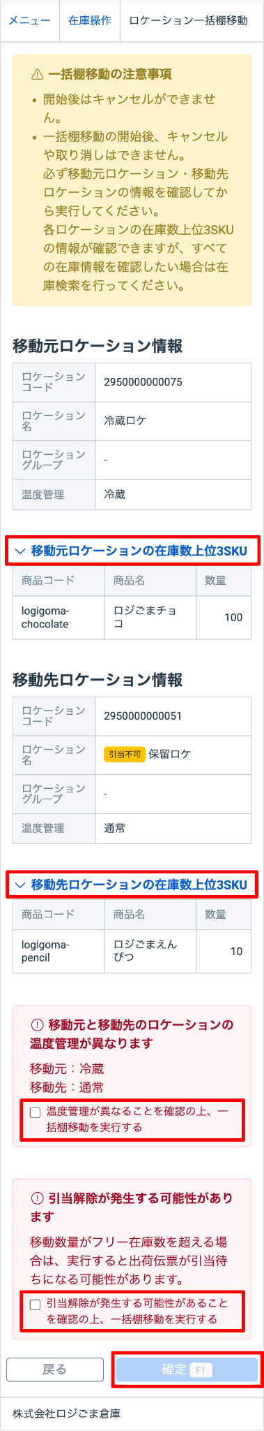 ロケーション一括棚移動の確認画面では、ロケーションの情報と、ロケーション内の在庫数上位3SKUの情報のみを表示します。