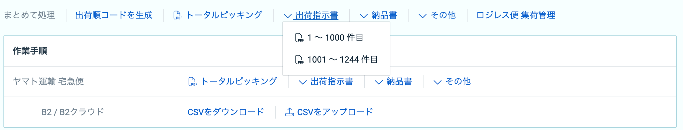 1つの出荷作業グループに1000件以上出荷伝票が存在する場合、出荷指示書は1000件ずつ分割してダウンロードします。