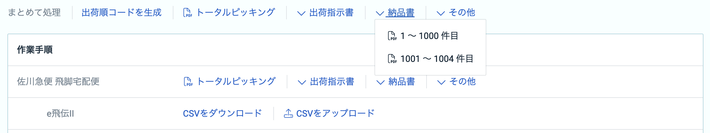 1つの出荷作業グループに1000件以上出荷伝票が存在する場合、納品書は1000件ずつ分割してダウンロードします。
