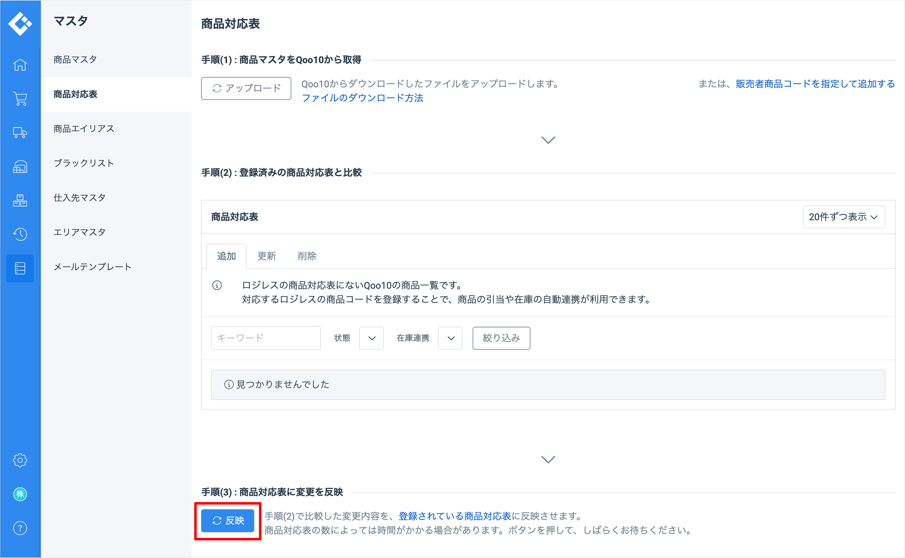 Qoo10の商品ページにLOGILESSの在庫数を反映させるためには、商品対応表を作成して、自動在庫連携を有効化します。
