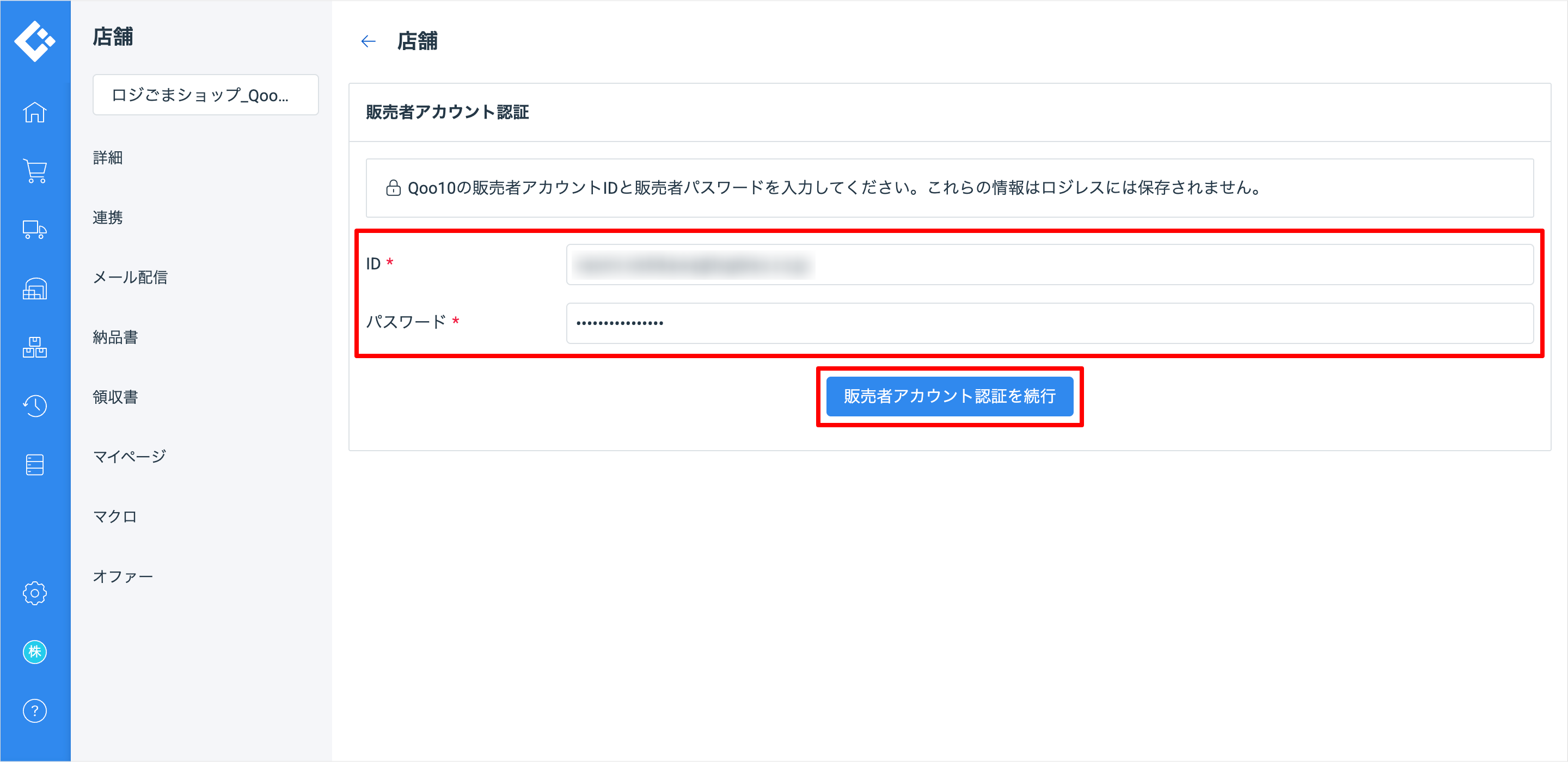 QSMにアクセス可能な認証情報を入力し、「販売者アカウント認証を続行」を押します。