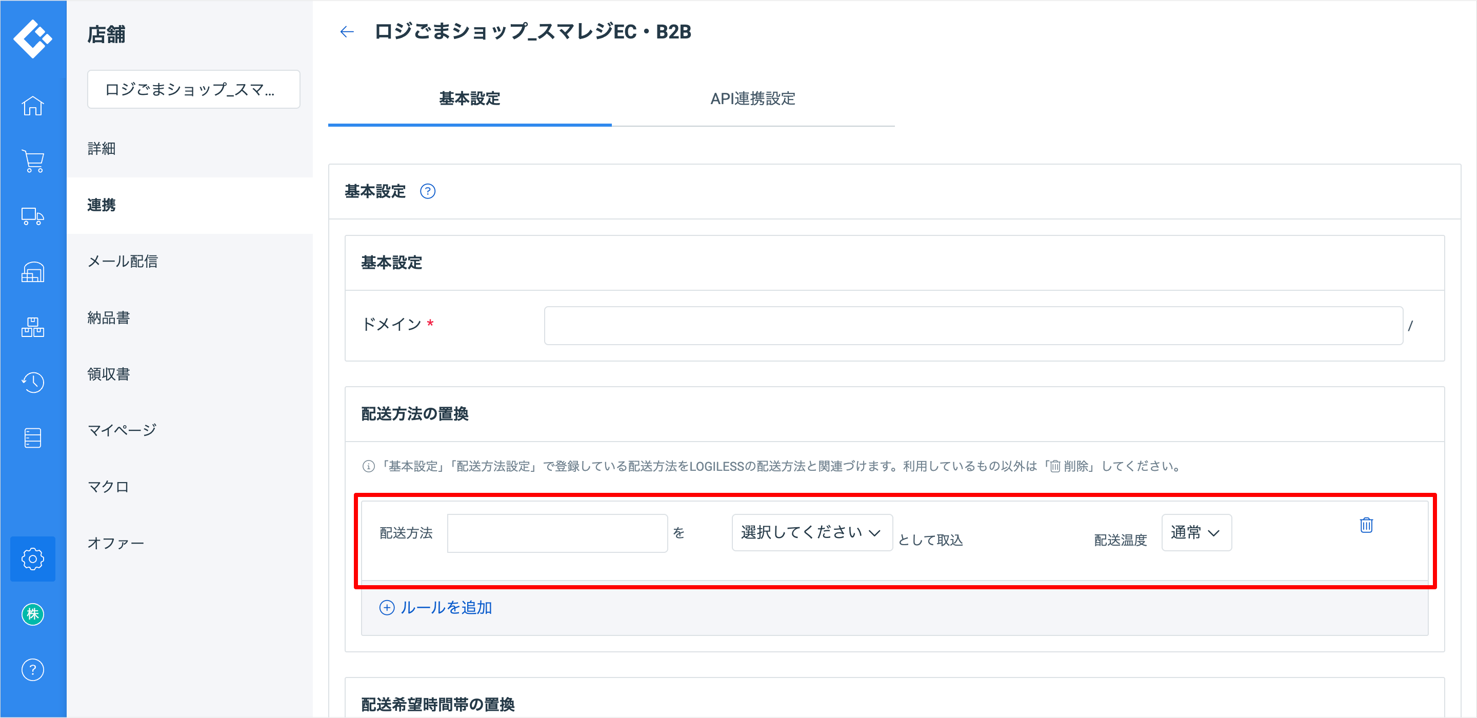 店舗の連携設定は、作成した店舗に配送方法や配送希望時間帯などの置換(マッピング)を設定する作業です。