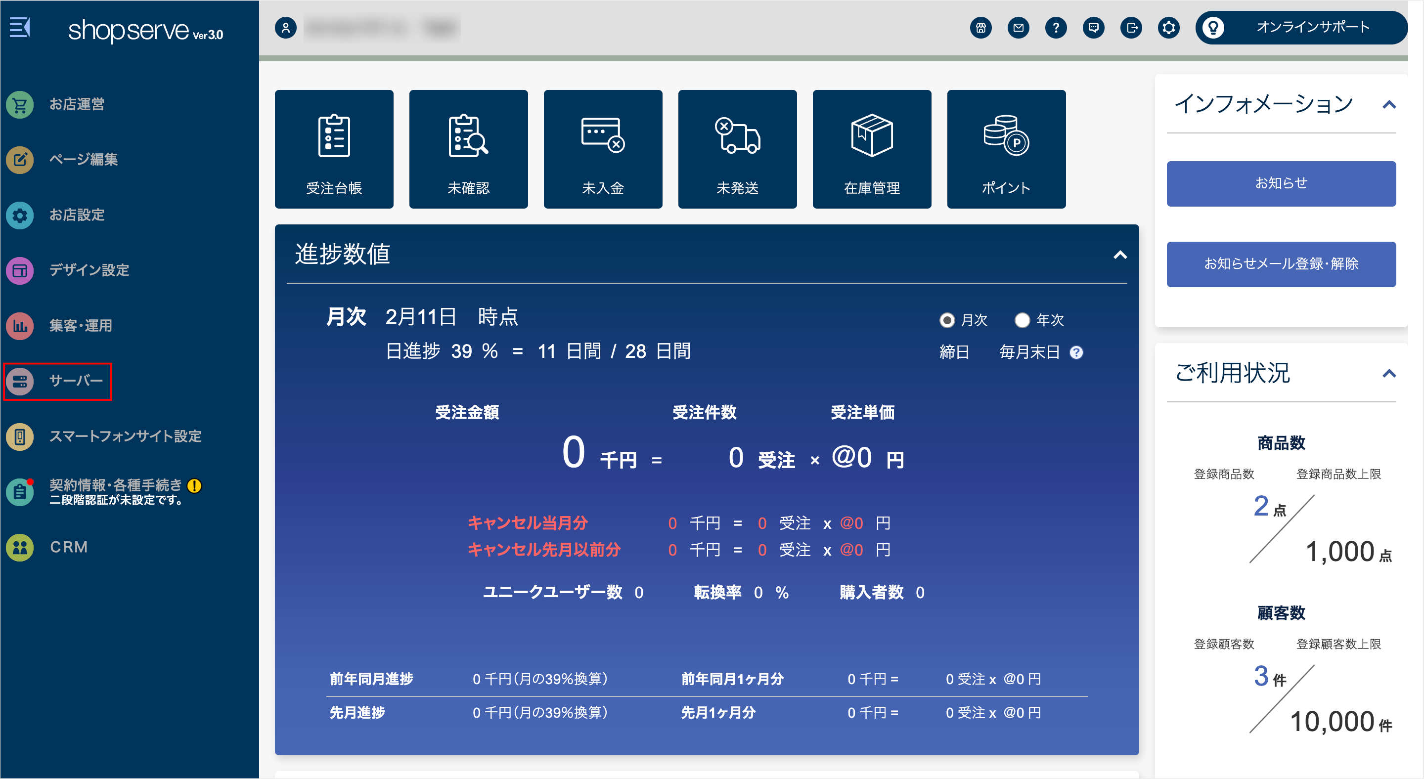 プラットフォームが「ショップサーブ」の「店舗名」を押します。