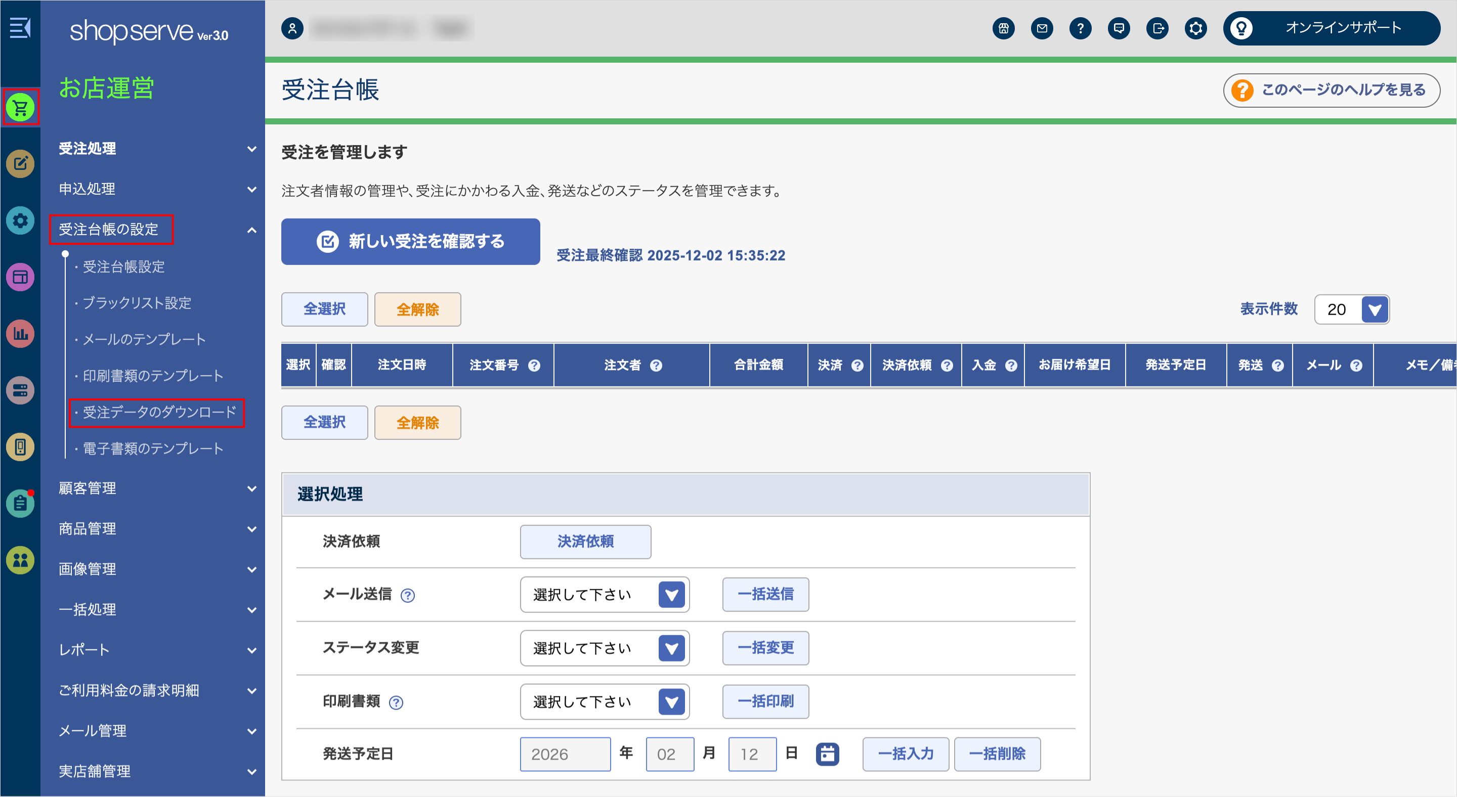 「お店運営」を押し、「受注台帳の設定」の「受注データのダウンロード」を押します。