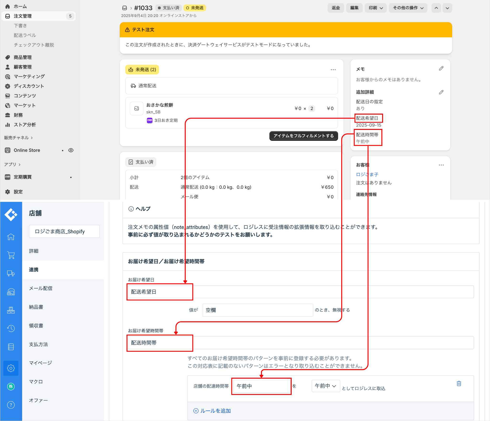 注文メモの属性値(note_attributes)の取り込み設定を行うことで、Shopifyの注文の拡張情報である「お届け希望日」や「お届け希望時間帯」「定期購入ID」「定期購入回数」などをLOGILESSに取り込むことができます。