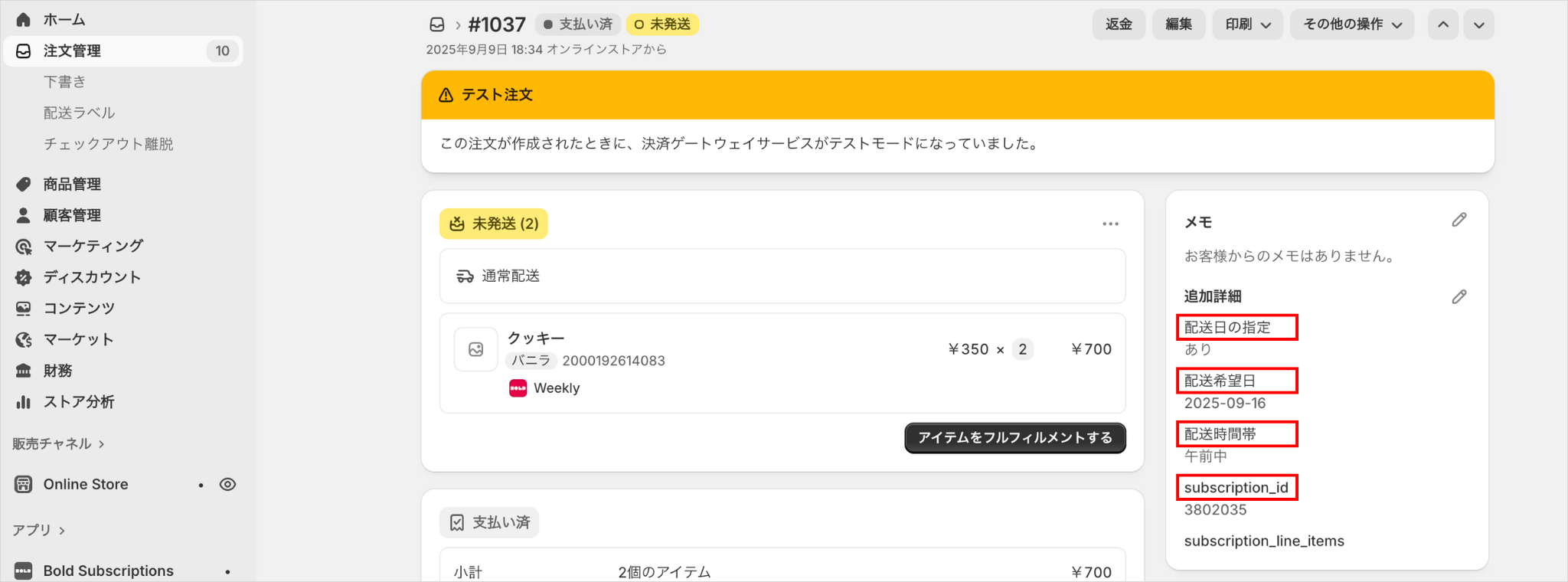 注文メモの属性値(note_attributes)はShopifyの「注文情報」から確認することができます。