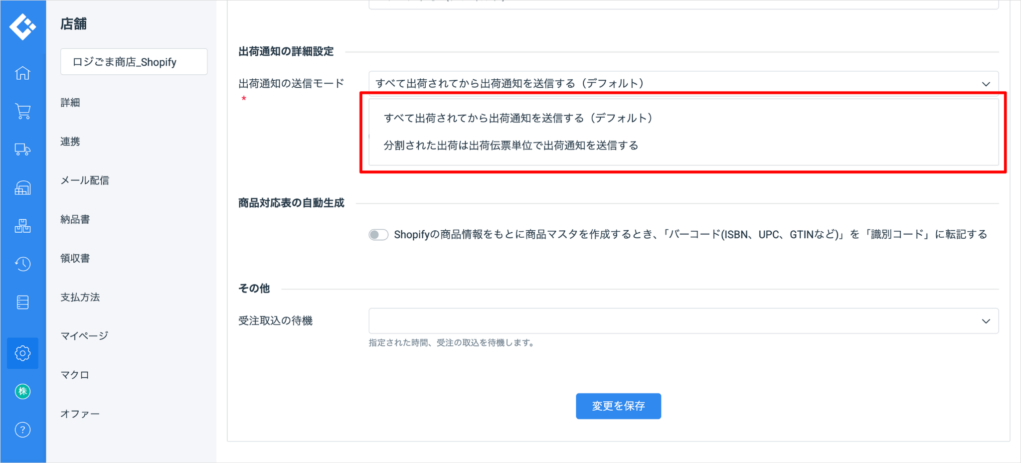 「出荷通知の詳細設定」の「出荷通知の送信モード」を変更します。