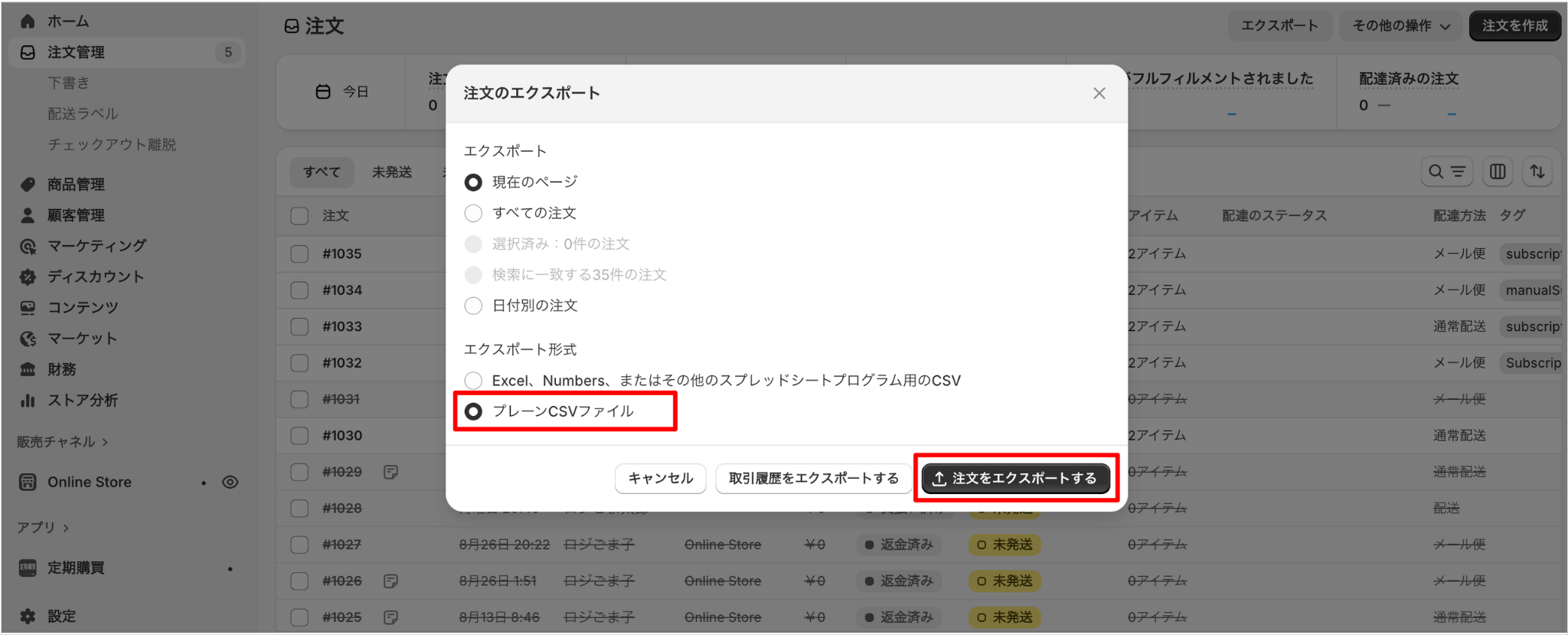 「エクスポート形式」で、「プレーンCSVファイル」を選択し、「注文をエクスポートする」を押します。「エクスポート」は該当する項目を選択してください。