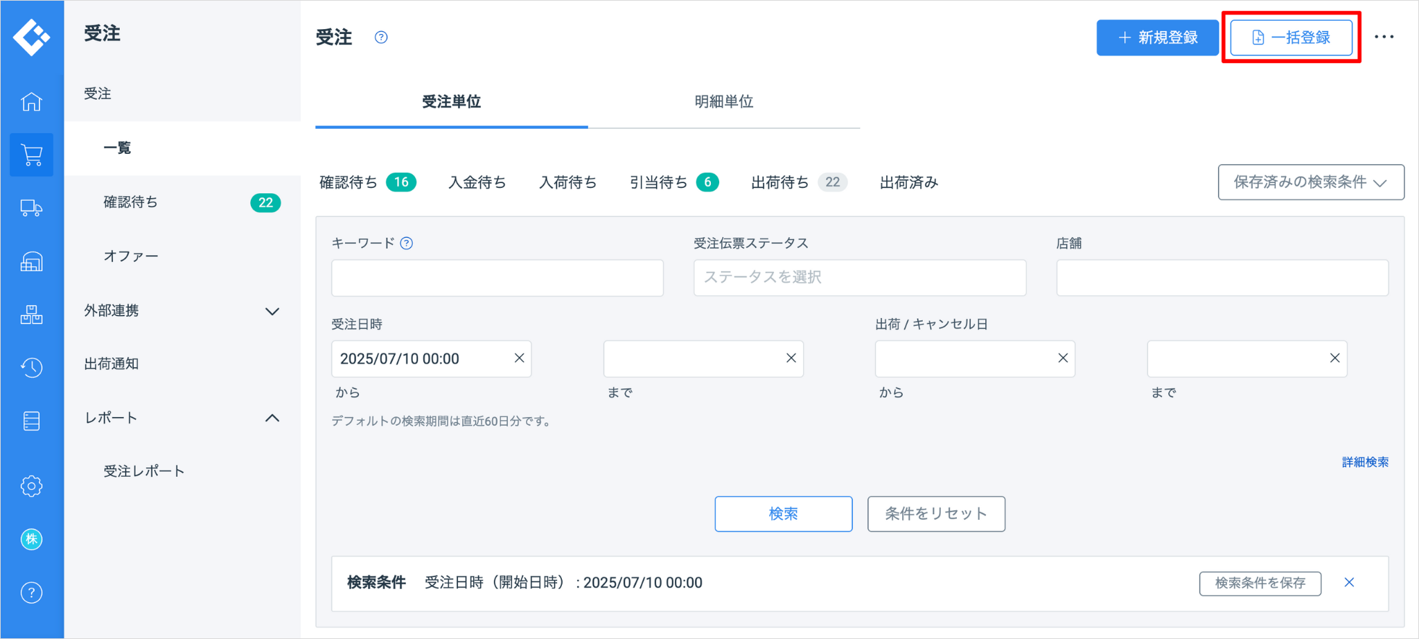 メインナビゲーションの「受注」を押します。