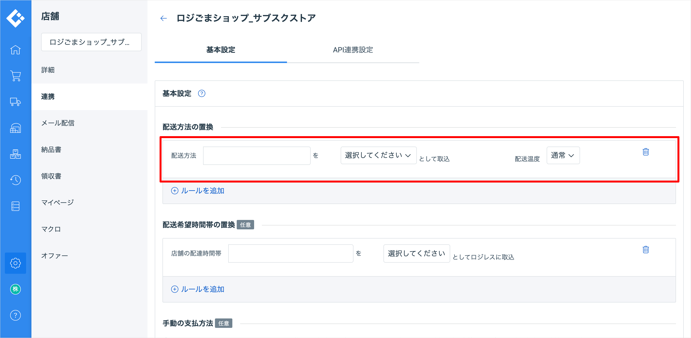 店舗の連携設定は、作成した店舗に配送方法や配送希望時間帯などの置換(マッピング)を設定する作業です。