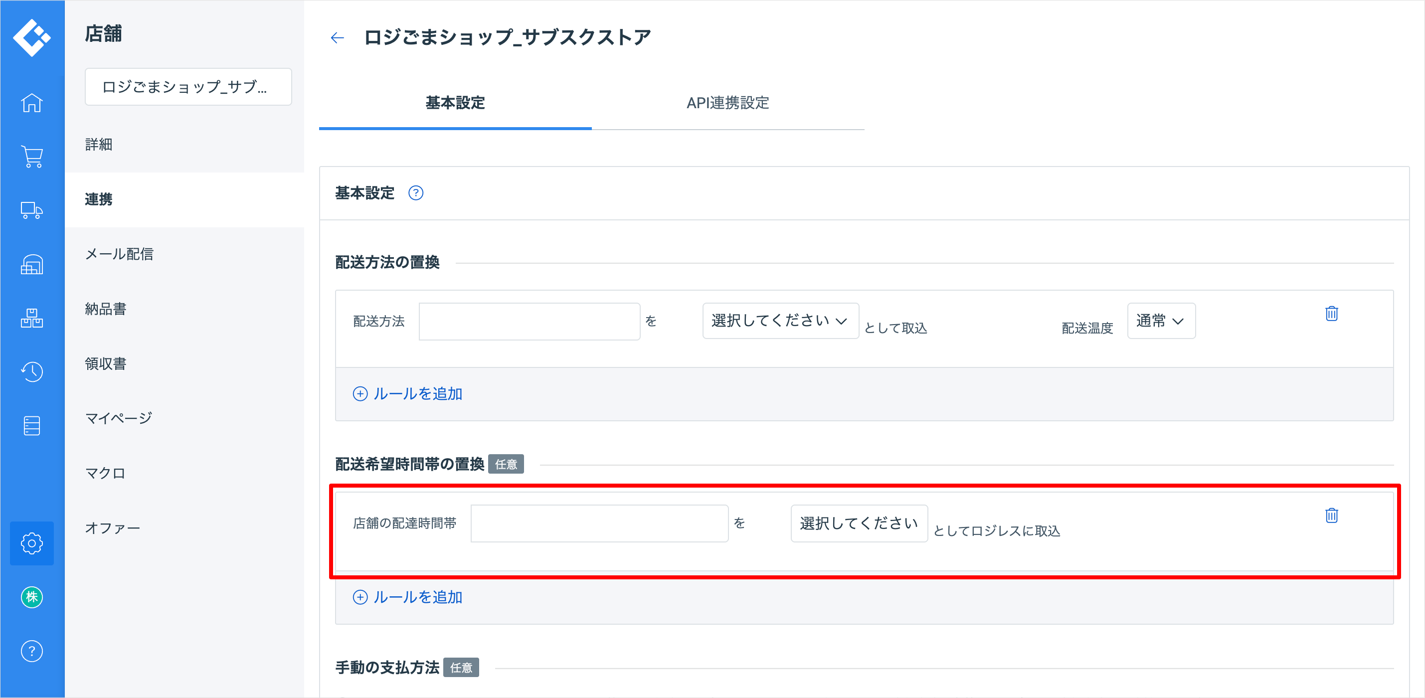「店舗の配送希望時間帯」には、サブスクストアで登録されている「配送時間」を入力します。