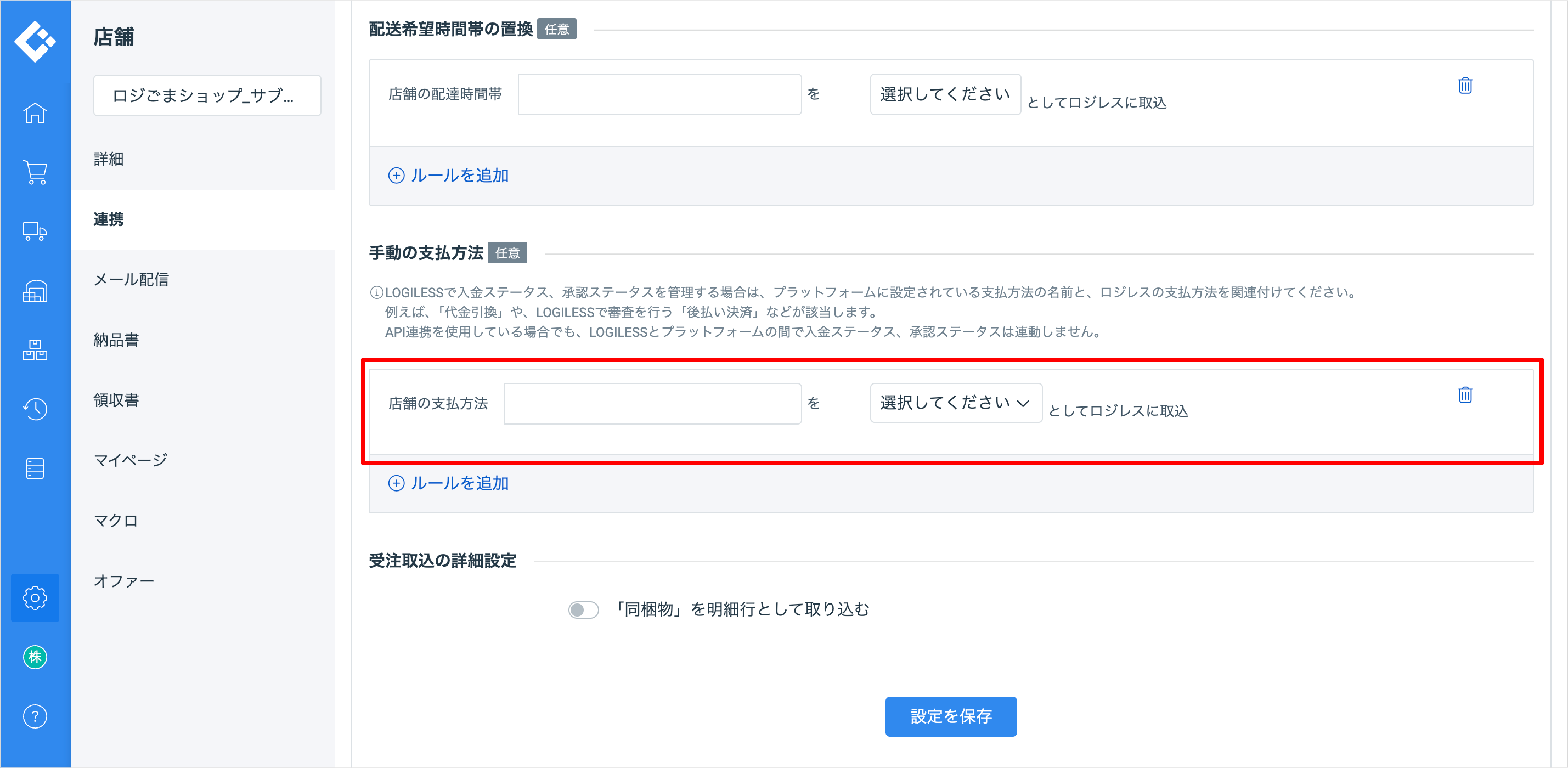 設定されている支払方法をLOGILESSの支払方法とマッピングします。