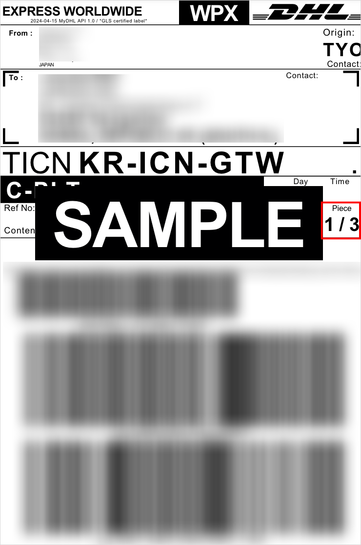 梱包数が2以上の場合は指定された梱包数の枚数分送り状が発行され、送り状の右側に「N/N」の表記で印字されます。例えば、梱包数「1」の場合は「1/1」、梱包数「2」の場合は「1/2」「2/2」と印字されます。